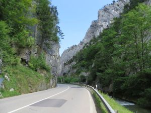 Lige så bølgende venlige Jurabjergene kan synes, lige så vilde og voldsomme er de, der hvor vandet i årmillionernes løb har skåret sig ned igennem. Først kommer der én slugt efter Court, så én, der begynder i Moutier, hvor jeg er ved at køre forkert. Jeg skal dreje for at følge vej 6 videre gennem slugten og endelig her før Chindez, hvor vejen ser ud til at være beskadiget af det store regnvejr for nylig.